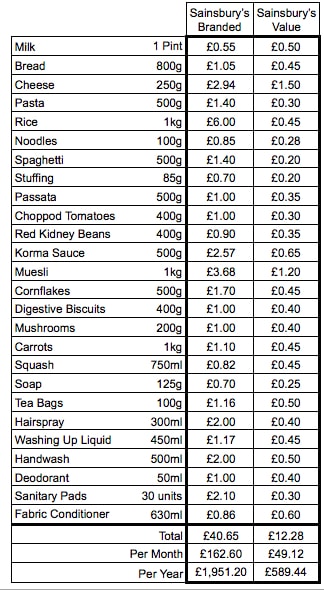 As you can see, on these 25 items, your yearly shopping cost would be £1,951.20 whereas your no-frills items would be under £589.44. This is a 70% saving!